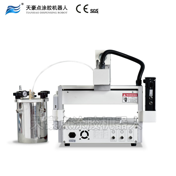 機器搭載膠閥儲料桶式控膠系統(tǒng)以及懸浮型機械手結(jié)構(gòu),一般適用于點膠用量較多的產(chǎn)品,其可代替人工在各種平面或曲面的產(chǎn)品上進行快速涂膠等自動作業(yè),并也徹底解決了許多人工涂膠造成的膠條粗細不均勻、產(chǎn)品一致性不好等問題。此外,機器配備的大容量儲料桶(可以存放膠水等一些流體)和天豪精密回吸膠閥,徹底的解決了自動涂膠作業(yè)中換料頻繁和關(guān)膠拉絲的現(xiàn)象。