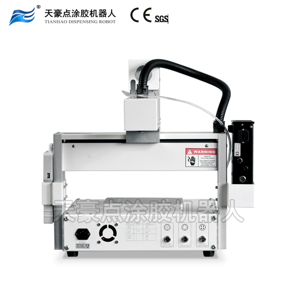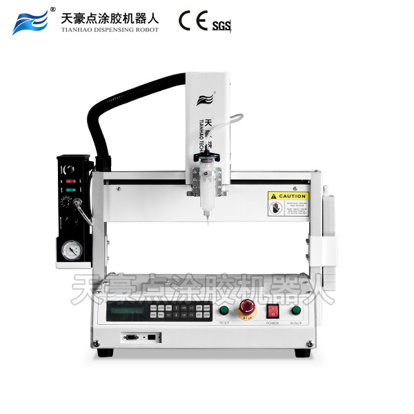 機器搭載針筒式精密定量控膠系統(tǒng)以及懸浮型機械手結構,一般適用于點膠用量較少的產(chǎn)品,其可代替人工在各種平面或曲面的產(chǎn)品上進行高精度微量的快速打點、畫線、畫圓等自動點膠作業(yè),并具備出膠定量精度高、重復性好等特點。