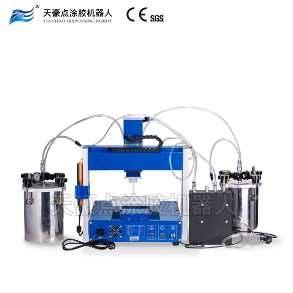 機(jī)器采用AB膠單獨(dú)分開(kāi)放入儲(chǔ)料桶內(nèi),其可代替人工進(jìn)行精確配比、充分混合、以及定量點(diǎn)涂膠工藝,從而解決了人工混合膠水時(shí)對(duì)身體表面的腐蝕,膠水氣味的刺鼻以及混合時(shí)掉入雜物等煩惱。另外,機(jī)器適用于目前市面上比例在1:1-1:3以內(nèi)的雙組份中低粘度膠水。
