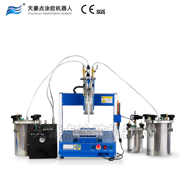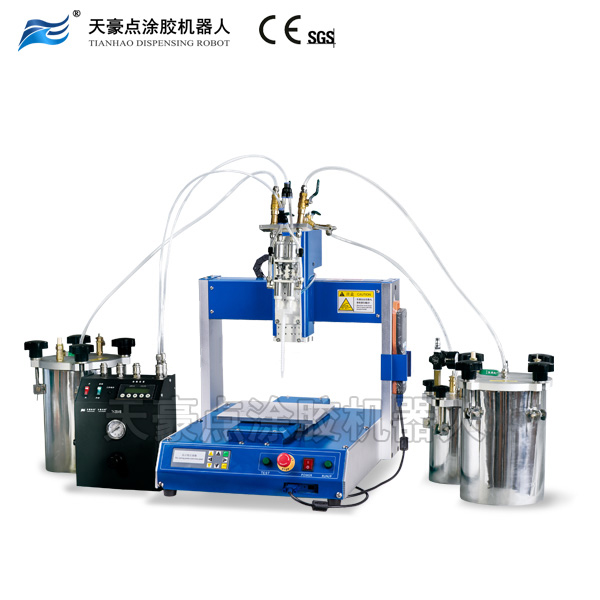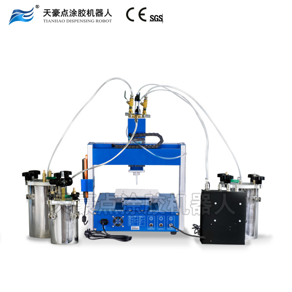 機(jī)器采用AB膠單獨(dú)分開放入儲(chǔ)料桶內(nèi)以及配備自動(dòng)清洗裝置,其可代替人工進(jìn)行精確配比、充分混合、自動(dòng)清洗以及定量點(diǎn)涂膠工藝,從而解決了人工混合膠水時(shí)對(duì)身體表面的腐蝕,膠水氣味的刺鼻以及混合時(shí)掉入雜物等煩惱。另外,機(jī)器適用于目前市面上比例在1:1-1:3以內(nèi)的雙組份中低粘度膠水。